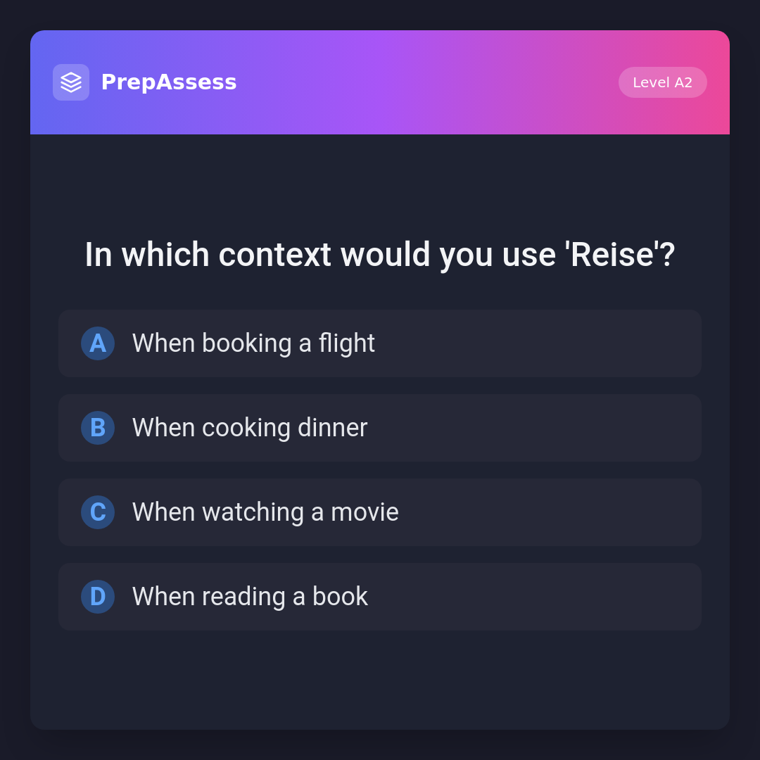 'Reise' is used in the context of travel and journeys, such as 'When booking a flight'. The other options do not typically involve the concept of a journey or travel.