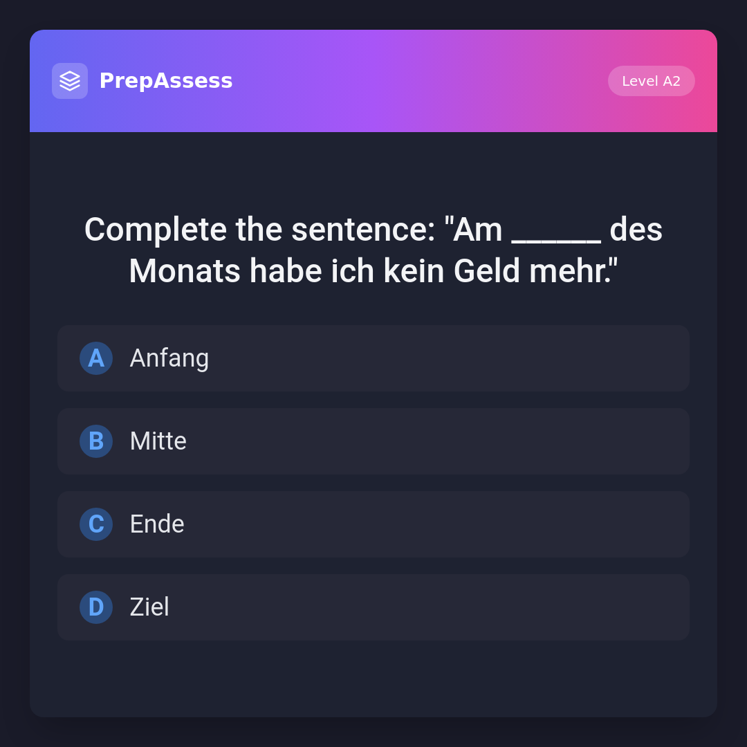 Complete the sentence: "Am ______ des Monats habe ich kein Geld mehr."