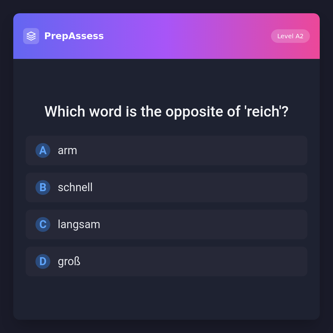 'Arm' is the opposite of 'reich', meaning 'poor'. 'Schnell' means 'fast', 'langsam' means 'slow', and 'groß' means 'big', none of which are antonyms of 'reich'.