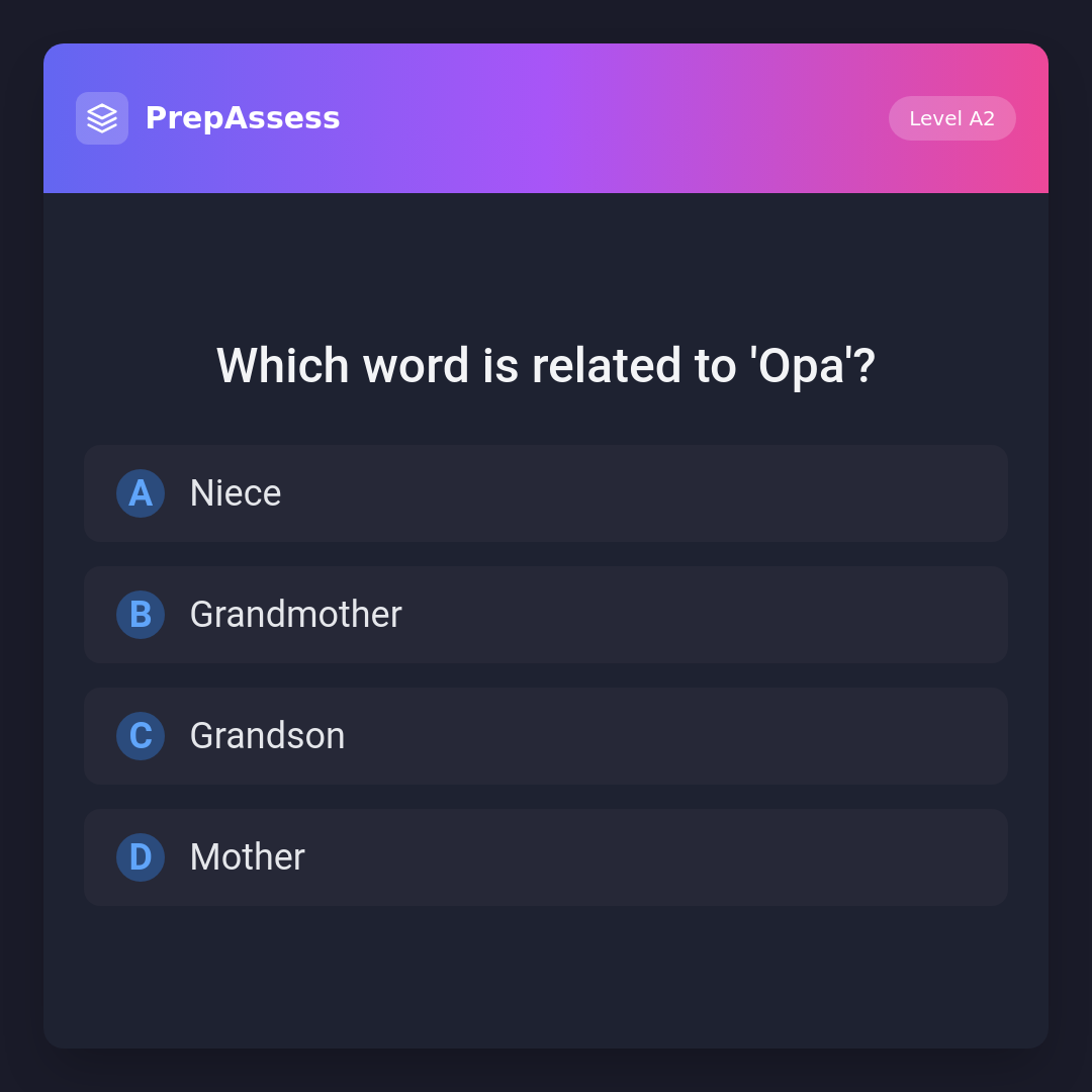 'Oma' is the German word for 'Grandmother', which is closely related to 'Opa' (Grandfather). 'Niece' is 'Nichte', 'Grandson' is 'Enkel', and 'Mother' is 'Mutter' in German.