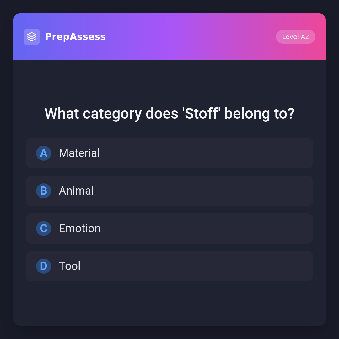 'Stoff' is a type of material, such as fabric or cloth. It does not belong to the categories of animal, emotion, or tool.
