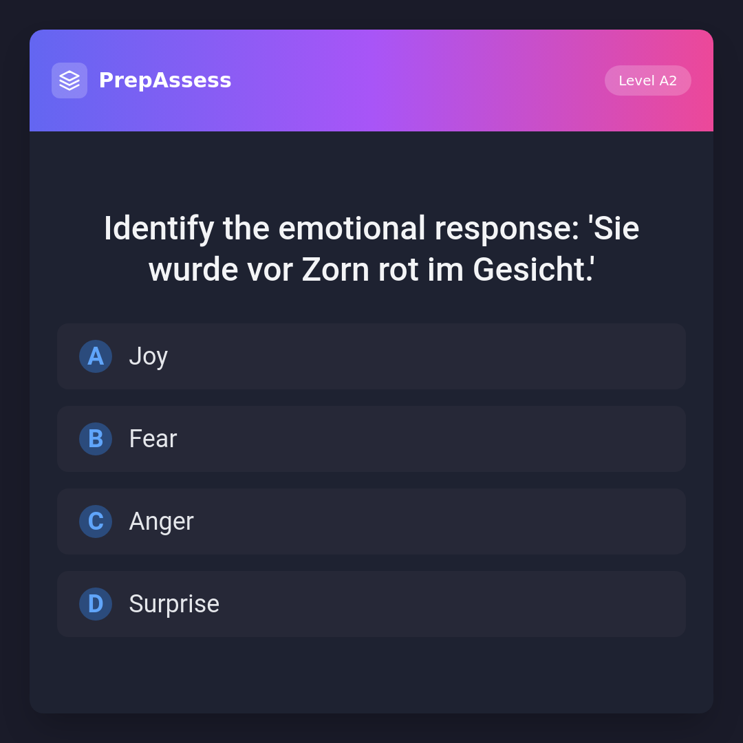 Identify the emotional response: 'Sie wurde vor Zorn rot im Gesicht.'