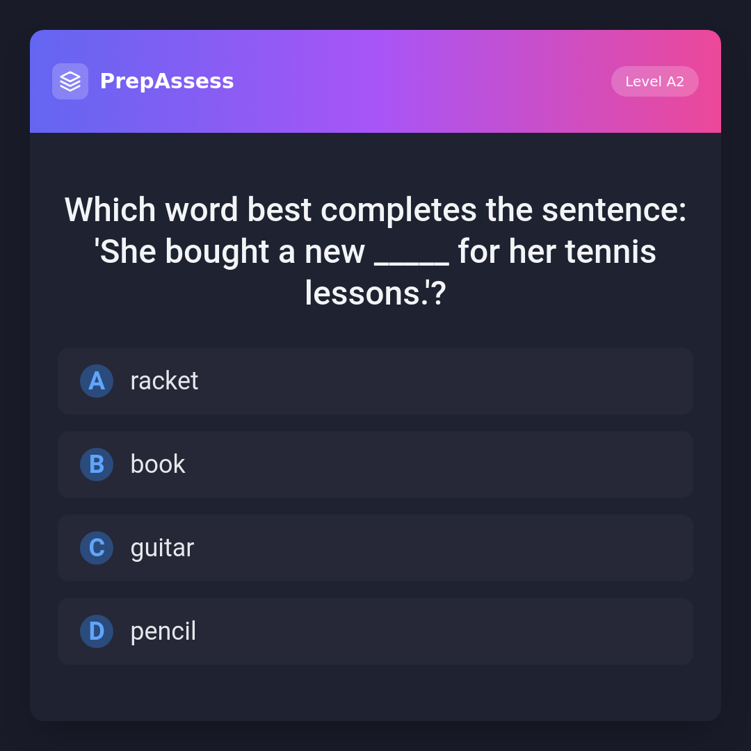Which word best completes the sentence: 'She bought a new _____ for her tennis lessons.'?