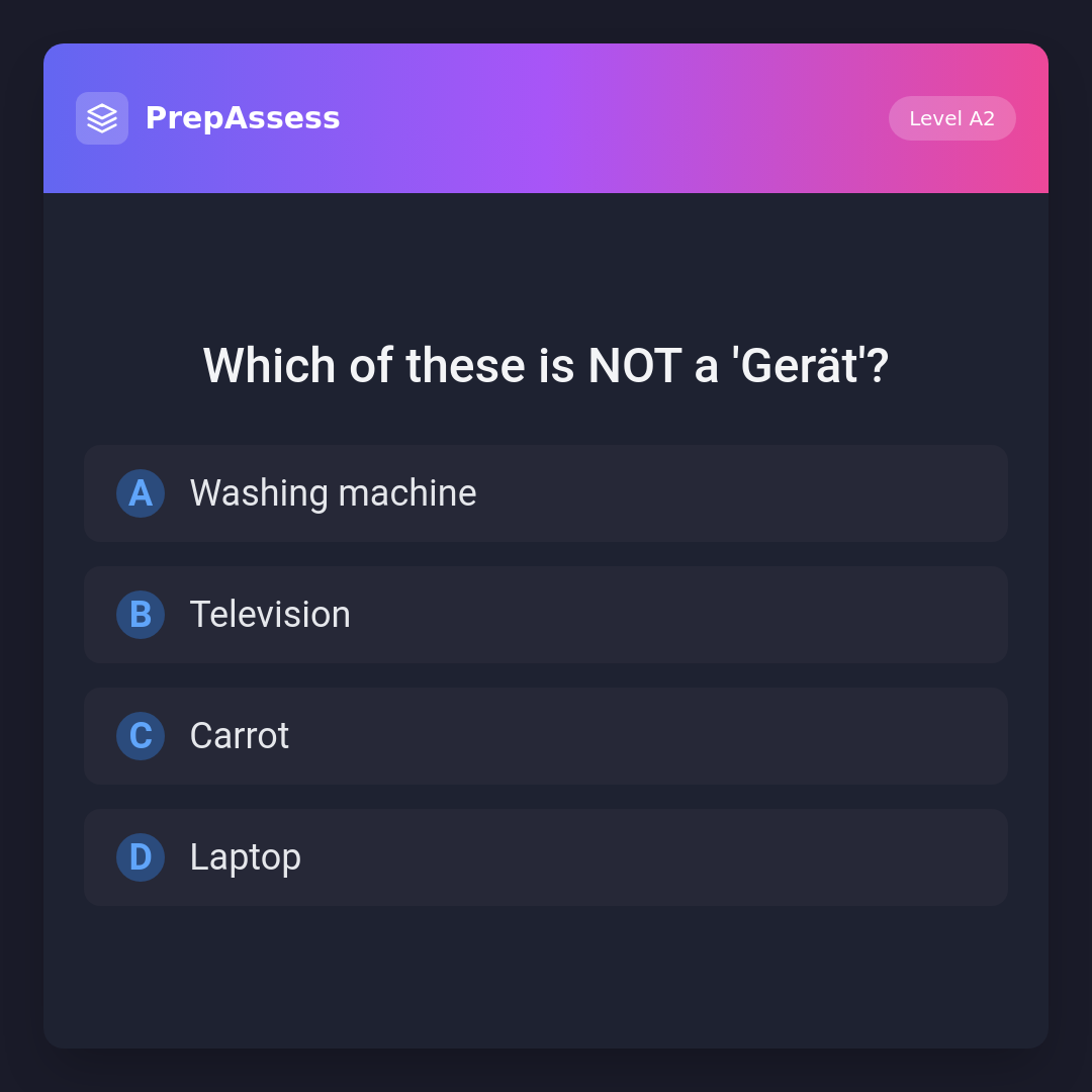 'Carrot' is not a 'Gerät' as it is a vegetable. 'Washing machine', 'television', and 'laptop' are all devices or appliances, fitting the definition of 'Gerät'.