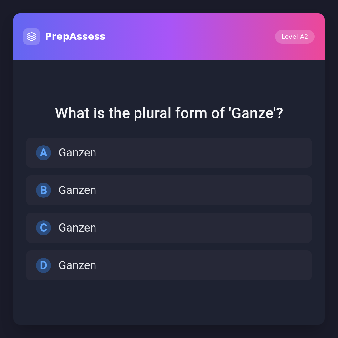 This question is a trick question. 'Ganze' does not have a plural form; it is an adjective meaning 'whole'. The options are intentionally the same to emphasize understanding of the concept rather than grammatical forms.