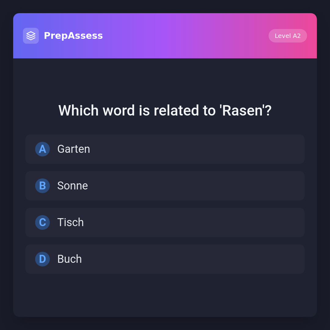 'Garten' means 'garden', which is related to 'Rasen' (lawn) as both are associated with outdoor areas. 'Sonne' means 'sun', 'Tisch' means 'table', and 'Buch' means 'book', which are not directly related.