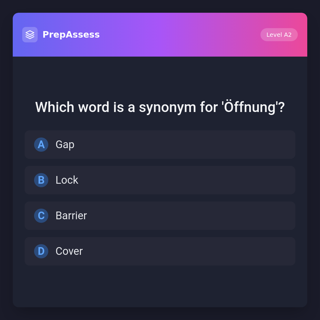 'Gap' is a synonym for 'Öffnung' because both refer to an opening or space between two objects. 'Lock', 'Barrier', and 'Cover' are opposites or unrelated to the concept of an opening.