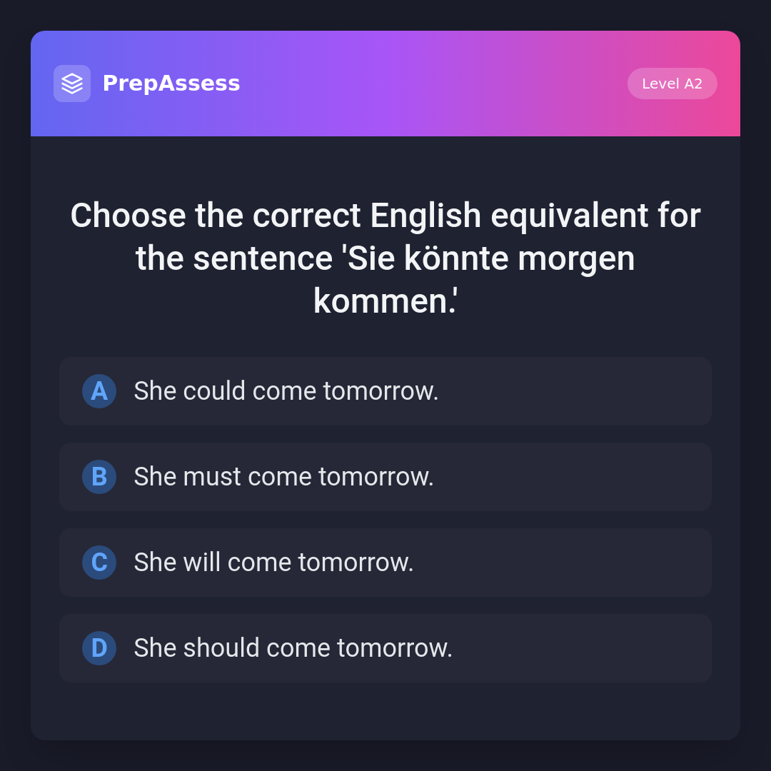 Choose the correct English equivalent for the sentence 'Sie könnte morgen kommen.'