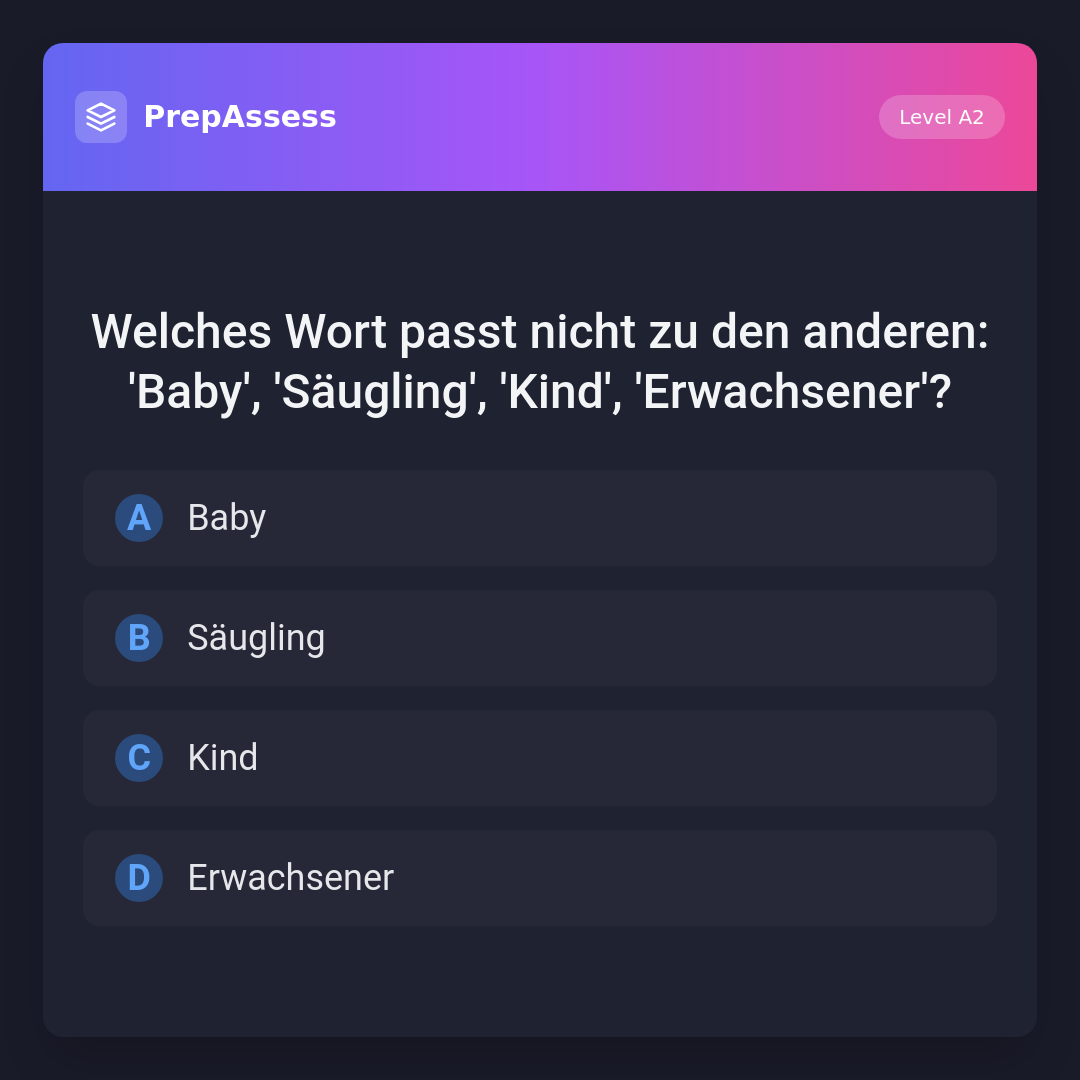 Welches Wort passt nicht zu den anderen: 'Baby', 'Säugling', 'Kind', 'Erwachsener'?