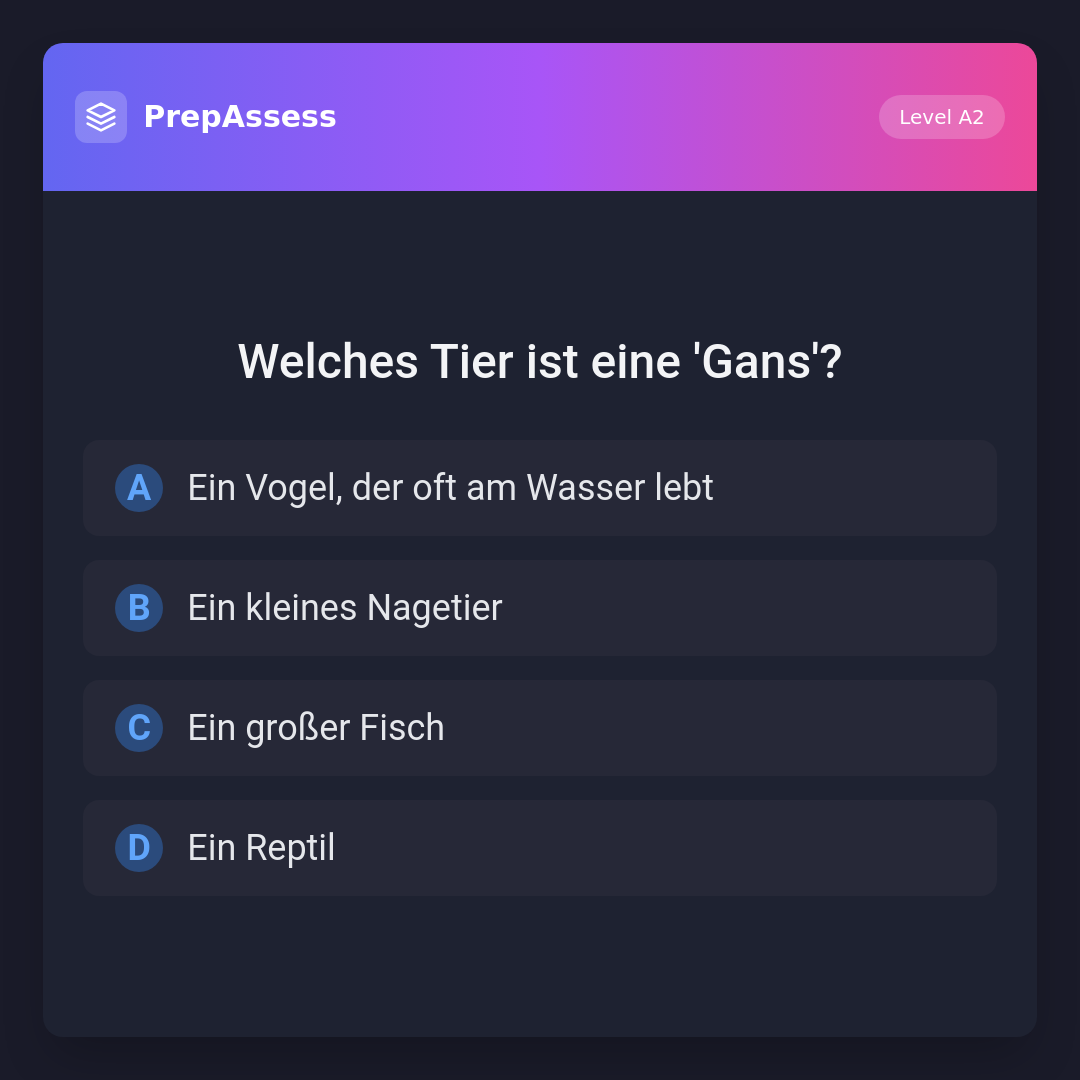 Eine 'Gans' ist ein Vogel, der oft am Wasser lebt. Sie ist kein Nagetier, Fisch oder Reptil.