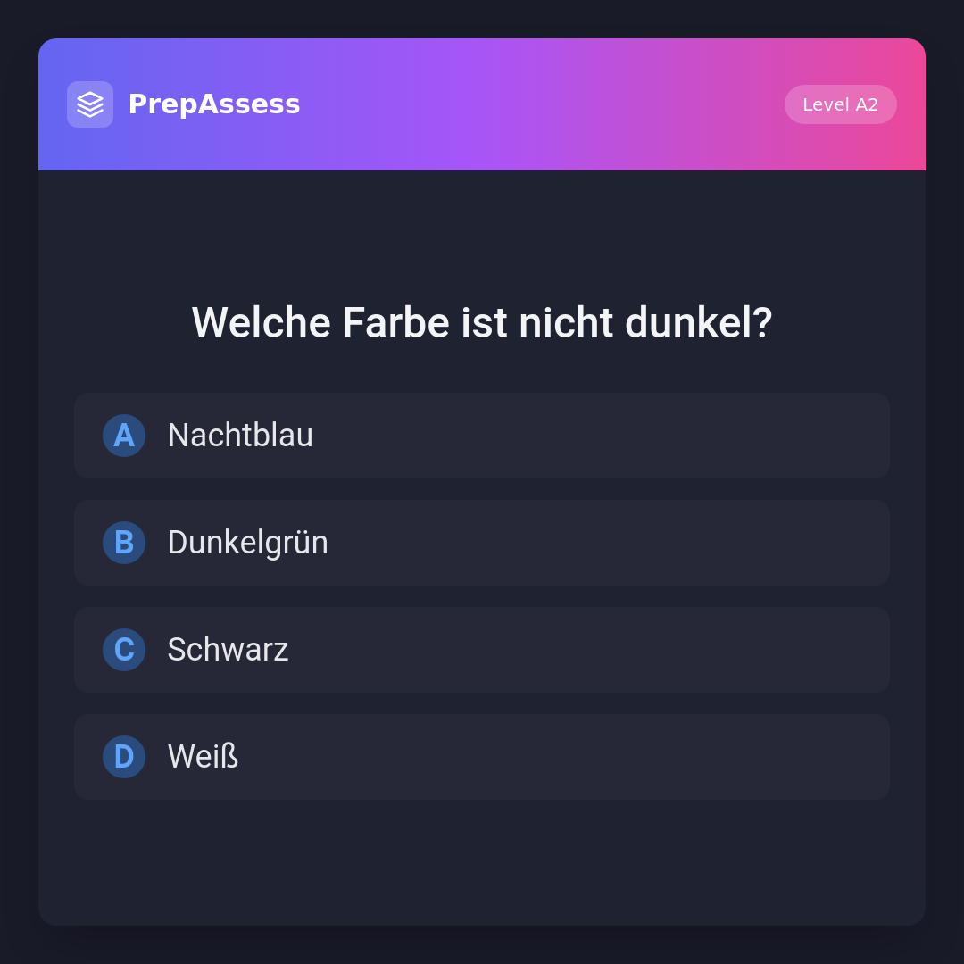 Weiß ist eine helle Farbe und nicht dunkel. Nachtblau, Dunkelgrün und Schwarz sind alle dunkle Farben.