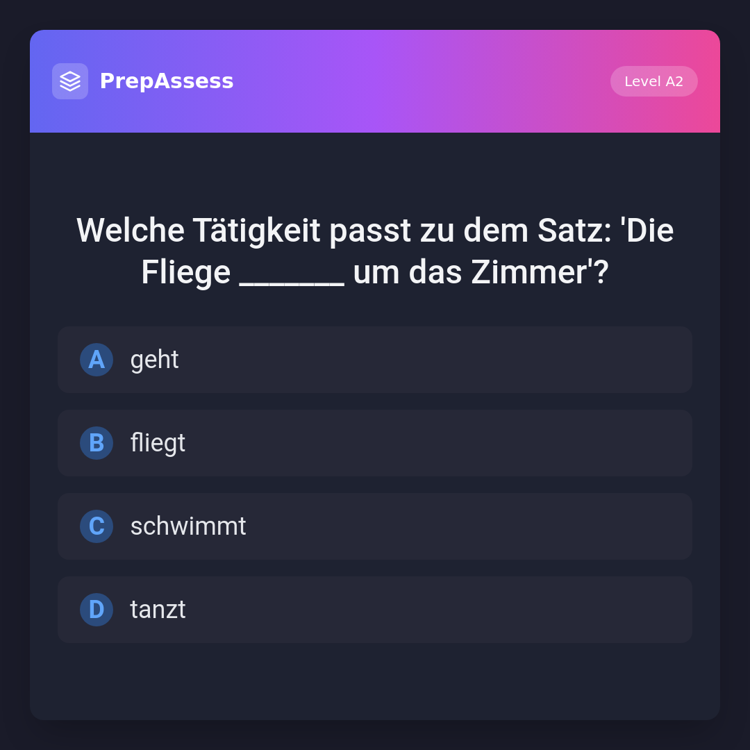 Welche Tätigkeit passt zu dem Satz: 'Die Fliege _______ um das Zimmer'?