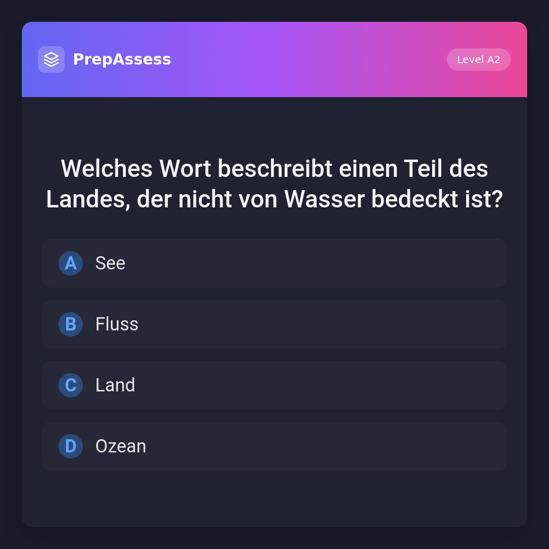 Welches Wort beschreibt einen Teil des Landes, der nicht von Wasser bedeckt ist?