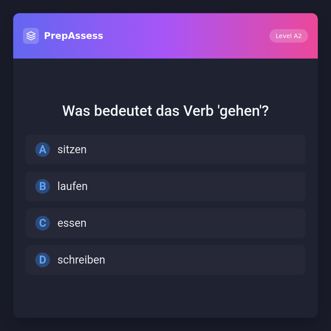 Das Verb 'gehen' bedeutet 'laufen' oder 'sich zu Fuß bewegen'. Die anderen Optionen beziehen sich auf andere Tätigkeiten: 'sitzen' bedeutet eine sitzende Position einnehmen, 'essen' ist die Nahrungsaufnahme und 'schreiben' bedeutet etwas mit einem Stift oder Computer zu notieren.
