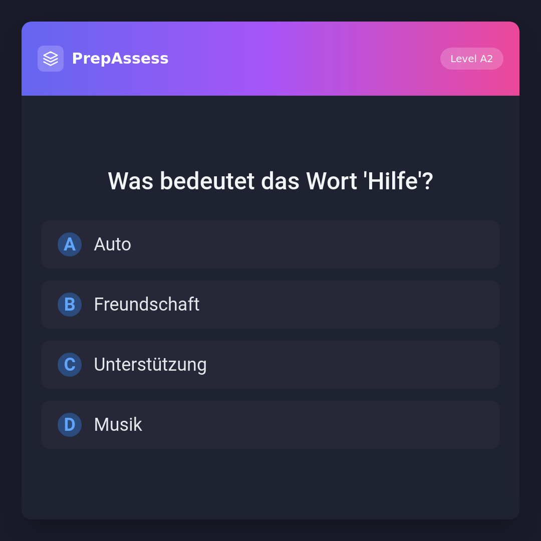 'Hilfe' bedeutet 'Unterstützung' oder 'Beistand'. Die anderen Optionen sind verschiedene Begriffe, die nichts mit 'Hilfe' zu tun haben.