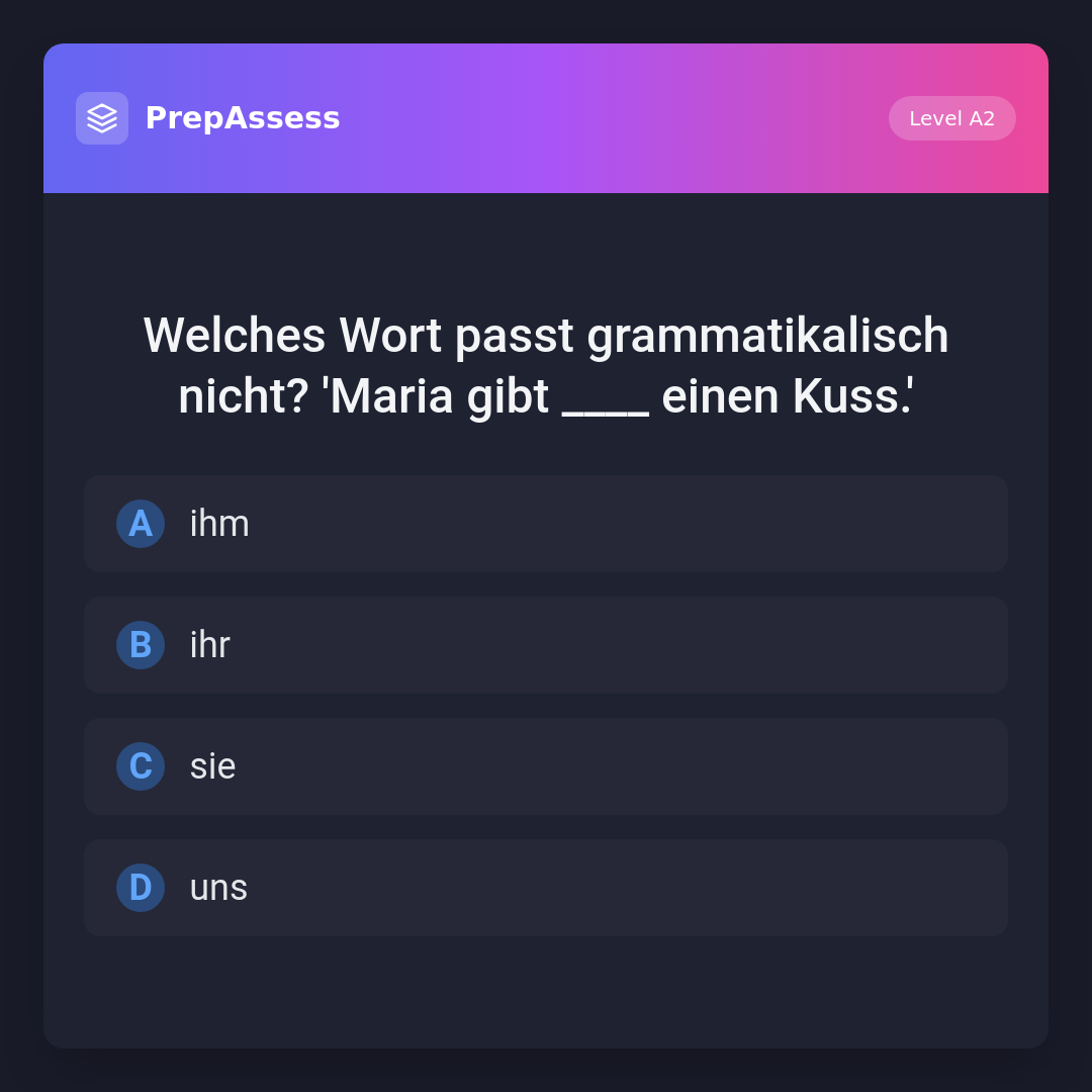 Welches Wort passt grammatikalisch nicht? 'Maria gibt ____ einen Kuss.'