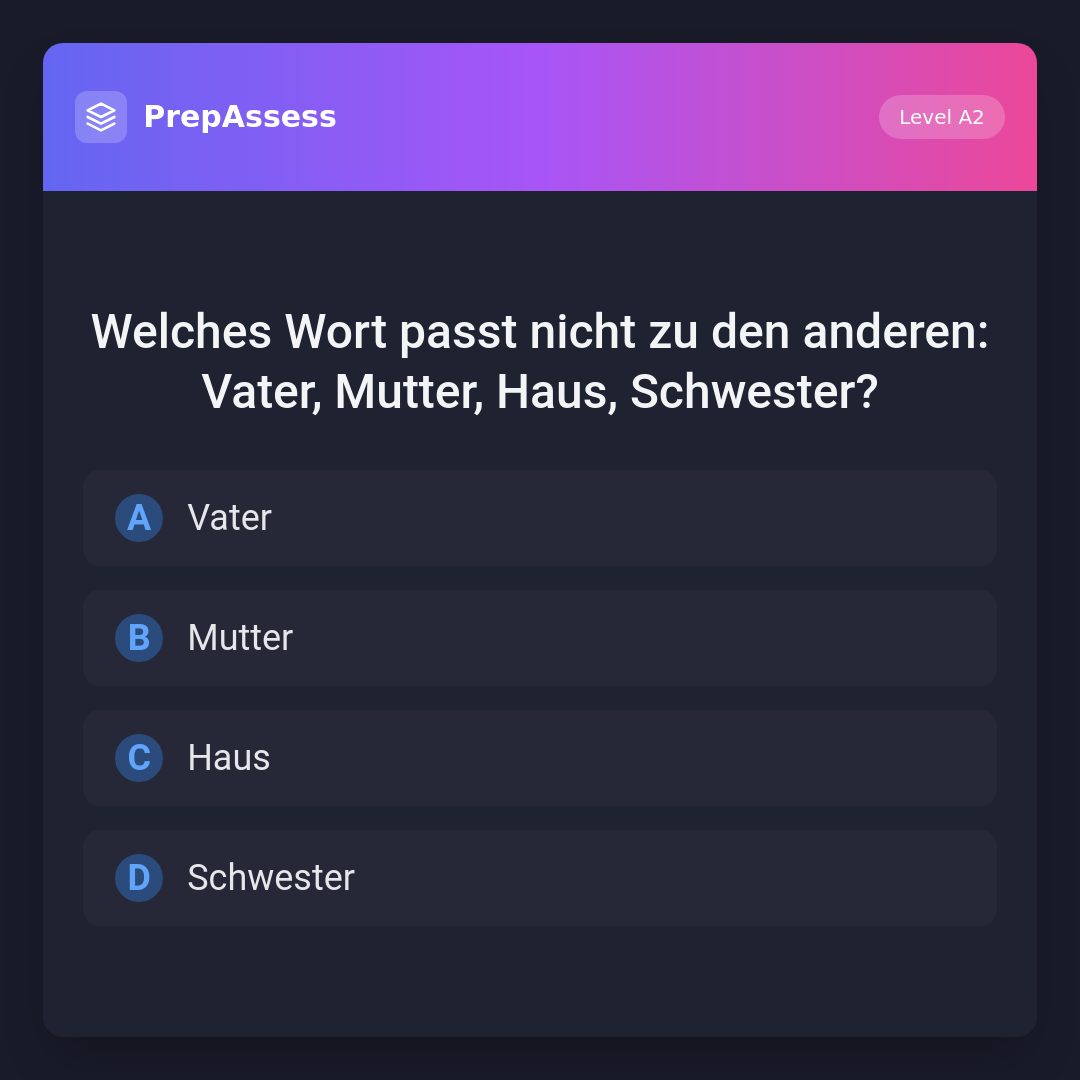 Welches Wort passt nicht zu den anderen: Vater, Mutter, Haus, Schwester?