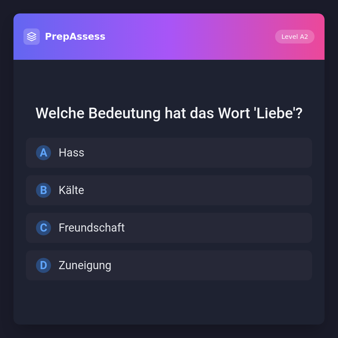 Das Wort 'Liebe' bedeutet Zuneigung oder starke positive Gefühle für jemanden oder etwas. 'Hass' ist das Gegenteil, 'Kälte' hat keine emotionale Verbindung, und 'Freundschaft' ist eine andere Form der Beziehung.