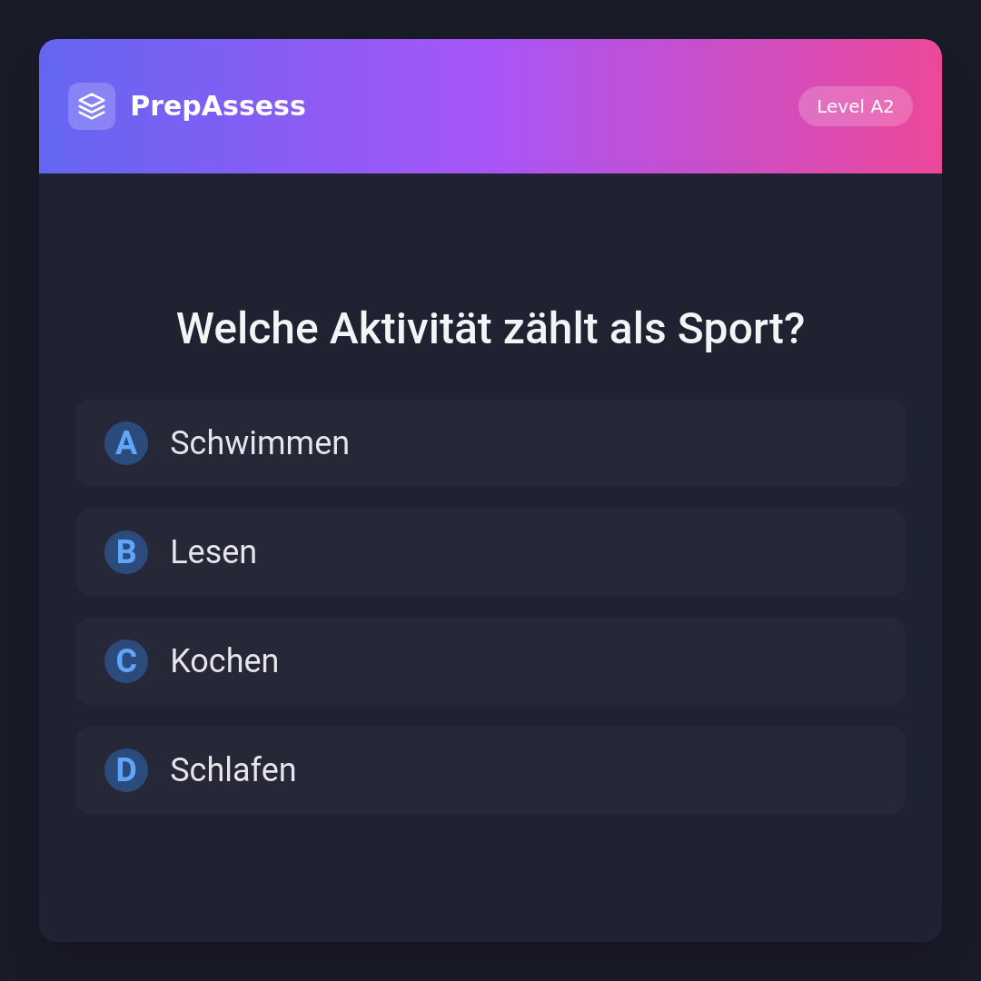 Schwimmen ist eine körperliche Aktivität und zählt als Sport. Lesen, Kochen und Schlafen sind keine sportlichen Aktivitäten.