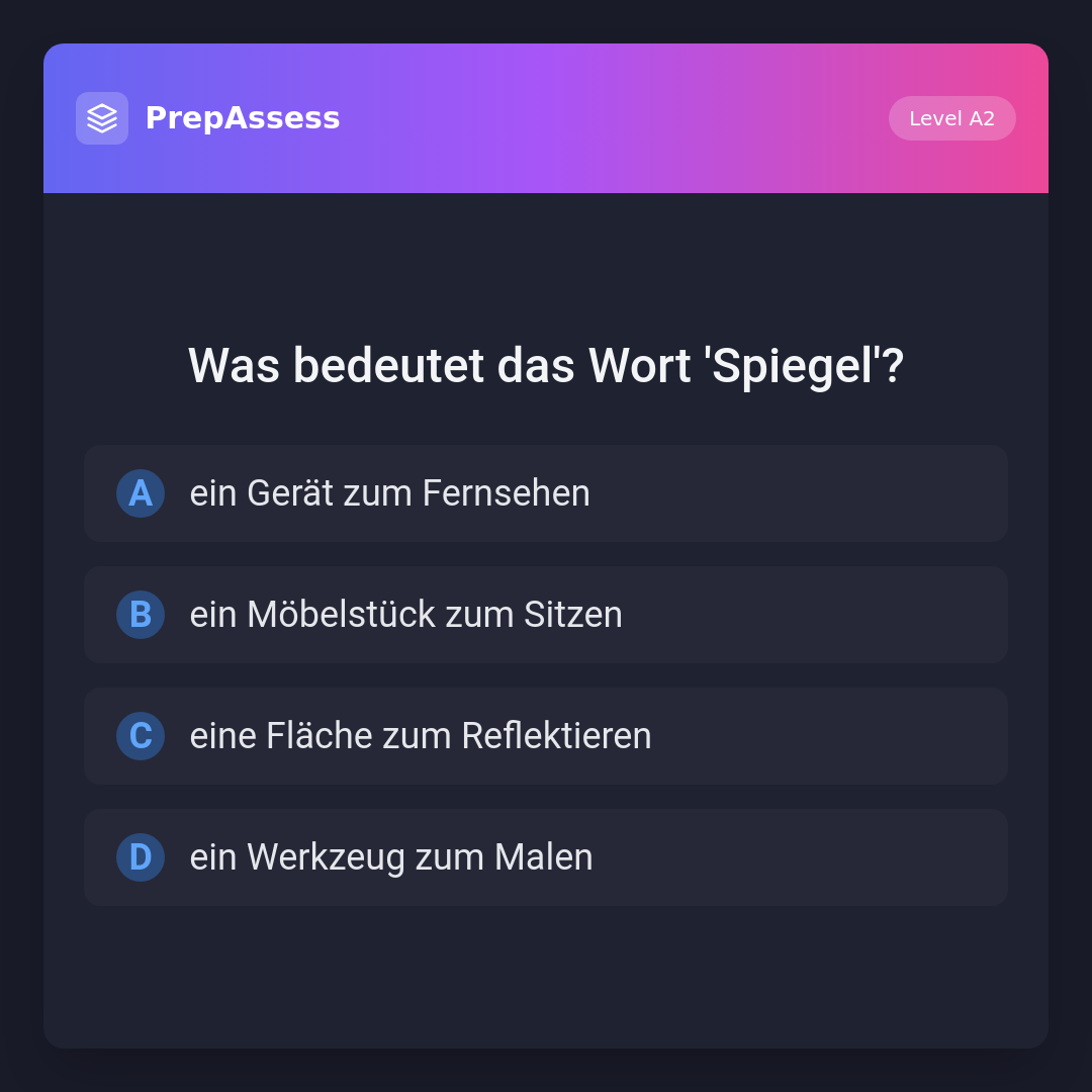 Das Wort 'Spiegel' bedeutet eine Fläche, die Licht reflektiert, sodass man sein eigenes Bild sehen kann. Die anderen Optionen beschreiben andere Gegenstände: 'Fernsehen' ist ein Gerät zum Ansehen von Programmen, 'Möbelstück zum Sitzen' bezieht sich auf einen Stuhl oder Sessel, und 'Werkzeug zum Malen' könnte ein Pinsel sein.
