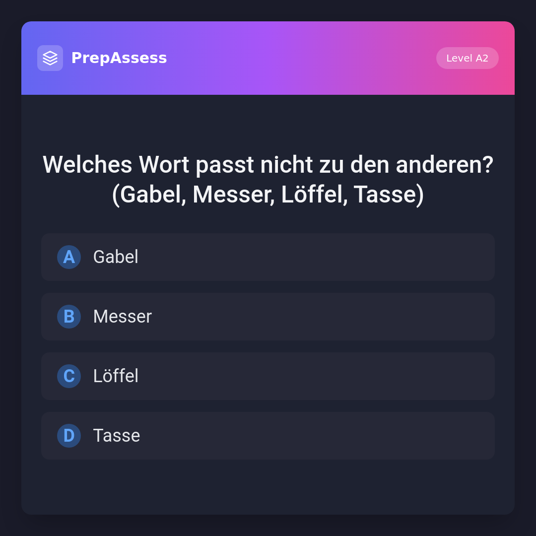 Welches Wort passt nicht zu den anderen? (Gabel, Messer, Löffel, Tasse)