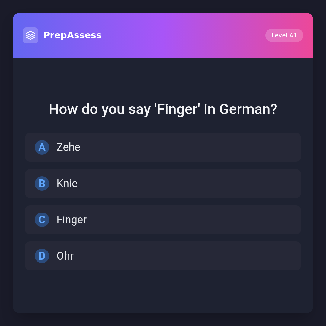 'Finger' is the German word for 'Finger'. 'Zehe' means 'Toe', 'Knie' means 'Knee', and 'Ohr' means 'Ear'.