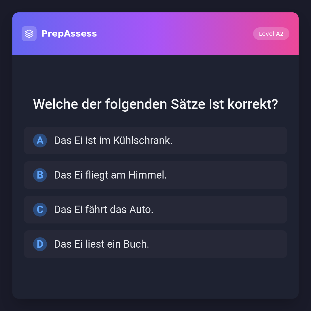 Der Satz 'Das Ei ist im Kühlschrank.' ist korrekt, da Eier oft im Kühlschrank aufbewahrt werden. Eier fliegen nicht, fahren kein Auto und lesen keine Bücher.