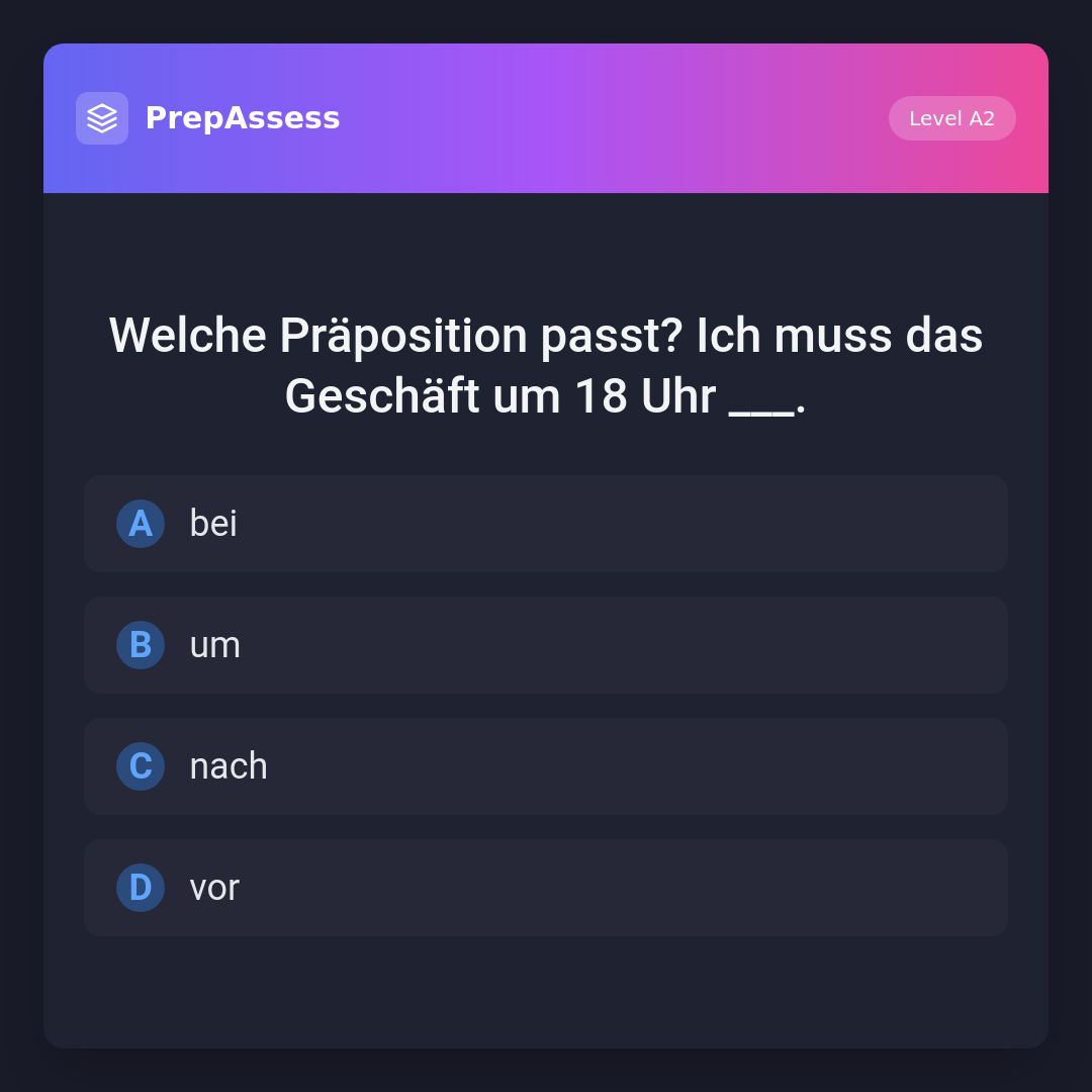 Welche Präposition passt? Ich muss das Geschäft um 18 Uhr ___.