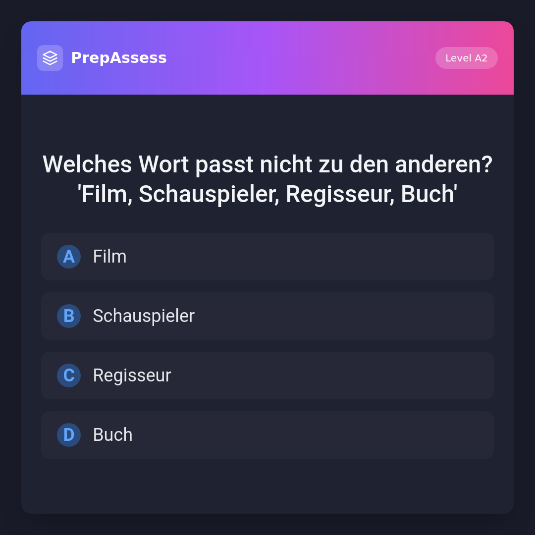 Welches Wort passt nicht zu den anderen? 'Film, Schauspieler, Regisseur, Buch'