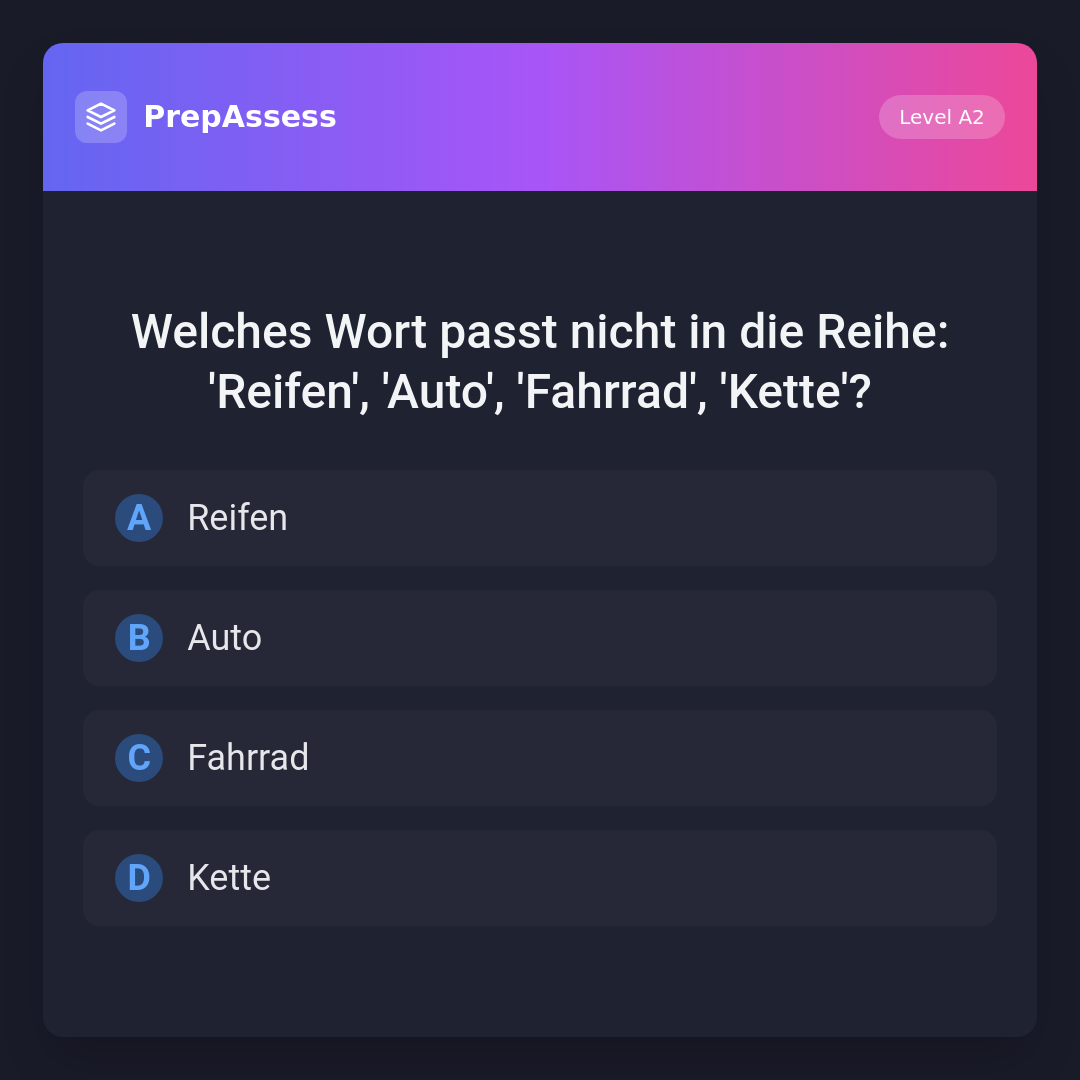 Welches Wort passt nicht in die Reihe: 'Reifen', 'Auto', 'Fahrrad', 'Kette'?
