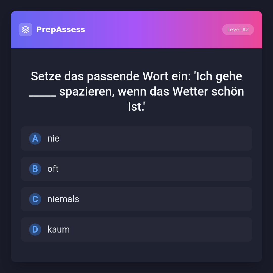 Setze das passende Wort ein: 'Ich gehe _____ spazieren, wenn das Wetter schön ist.'