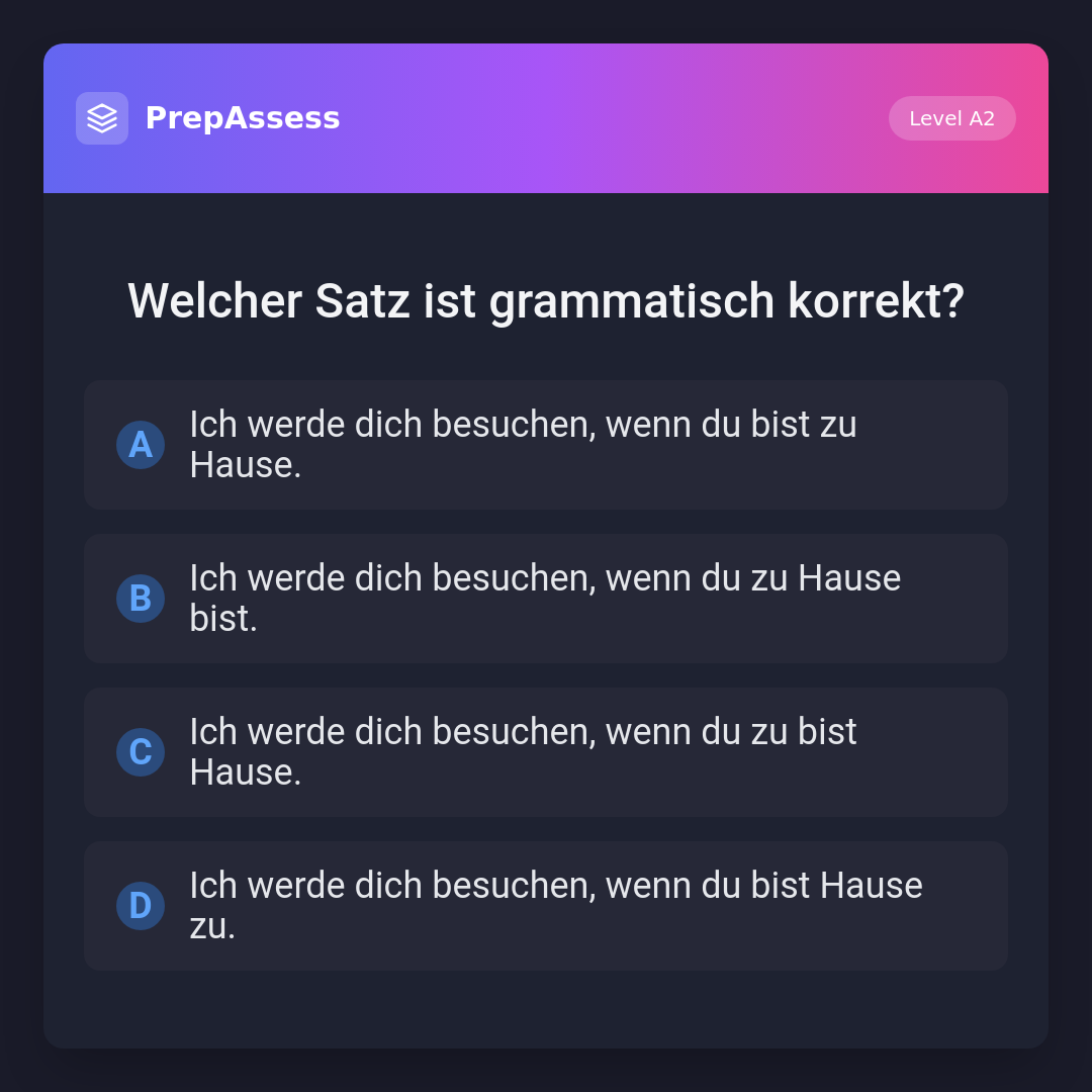 Option b ist korrekt, da das Verb 'bist' am Ende des Nebensatzes steht, was der deutschen Satzstruktur entspricht. Die anderen Optionen sind grammatisch falsch.