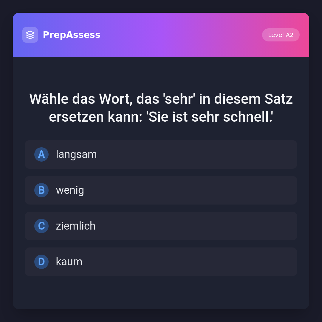 Wähle das Wort, das 'sehr' in diesem Satz ersetzen kann: 'Sie ist sehr schnell.'