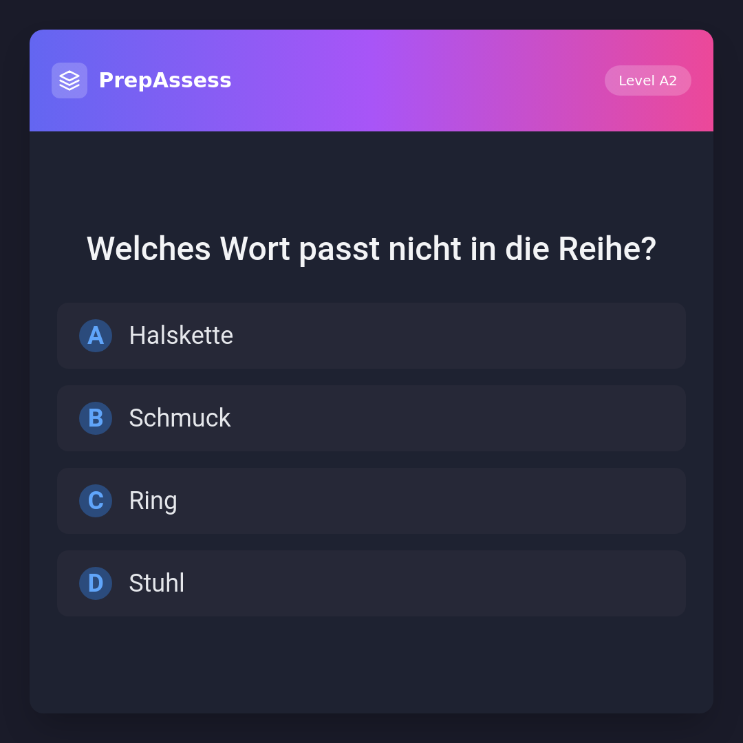 Die Wörter 'Halskette', 'Schmuck' und 'Ring' gehören alle zum Bereich Schmuck. 'Stuhl' ist ein Möbelstück und passt nicht zu den anderen Wörtern.