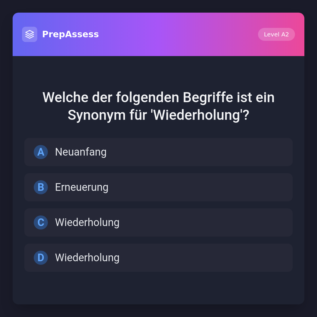 Welche der folgenden Begriffe ist ein Synonym für 'Wiederholung'?