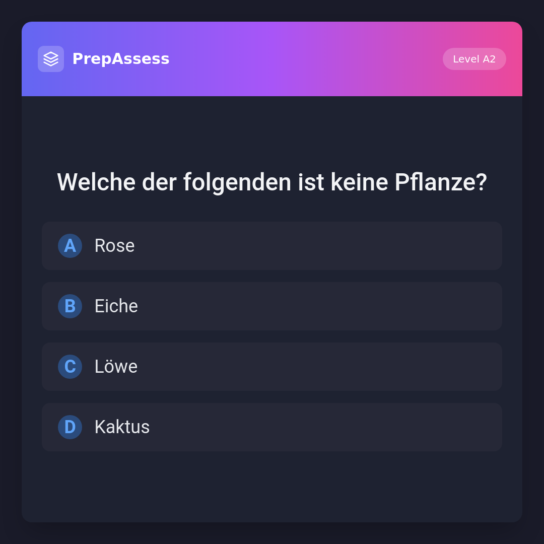 'Rose', 'Eiche', und 'Kaktus' sind alle Pflanzenarten. 'Löwe' ist ein Tier und daher keine Pflanze.