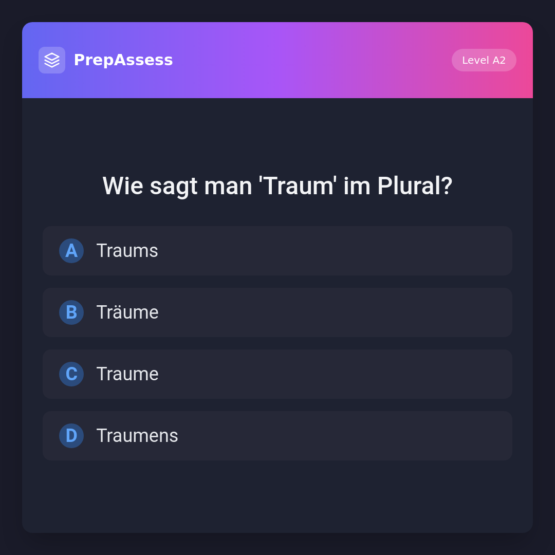 Die korrekte Pluralform von 'Traum' ist 'Träume'. Die anderen Optionen sind grammatisch falsch: 'Traums', 'Traume', und 'Traumens' existieren nicht im Deutschen.