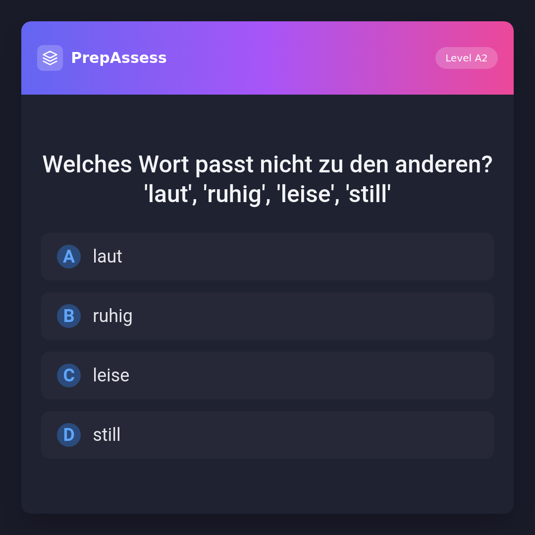 Welches Wort passt nicht zu den anderen? 'laut', 'ruhig', 'leise', 'still'