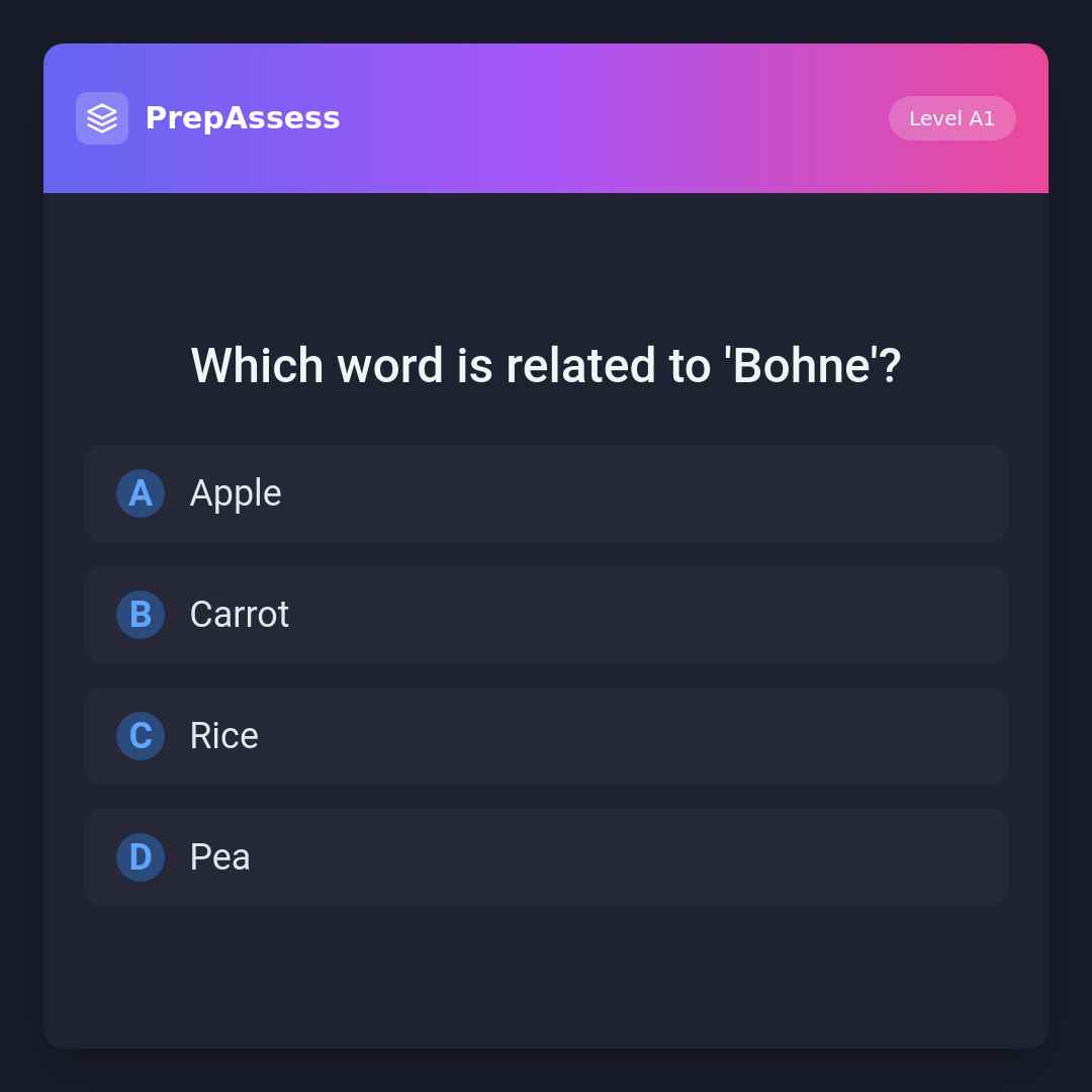 Both 'Bohne' (bean) and 'Pea' are legumes, which makes them related. 'Apple' is a fruit, 'Carrot' is a root vegetable, and 'Rice' is a grain.