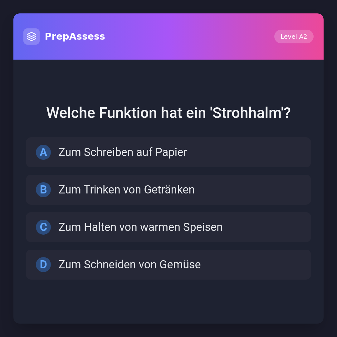 Ein Strohhalm wird verwendet, um Getränke zu trinken. Die anderen Optionen beschreiben Funktionen, die nicht mit einem Strohhalm in Verbindung stehen.