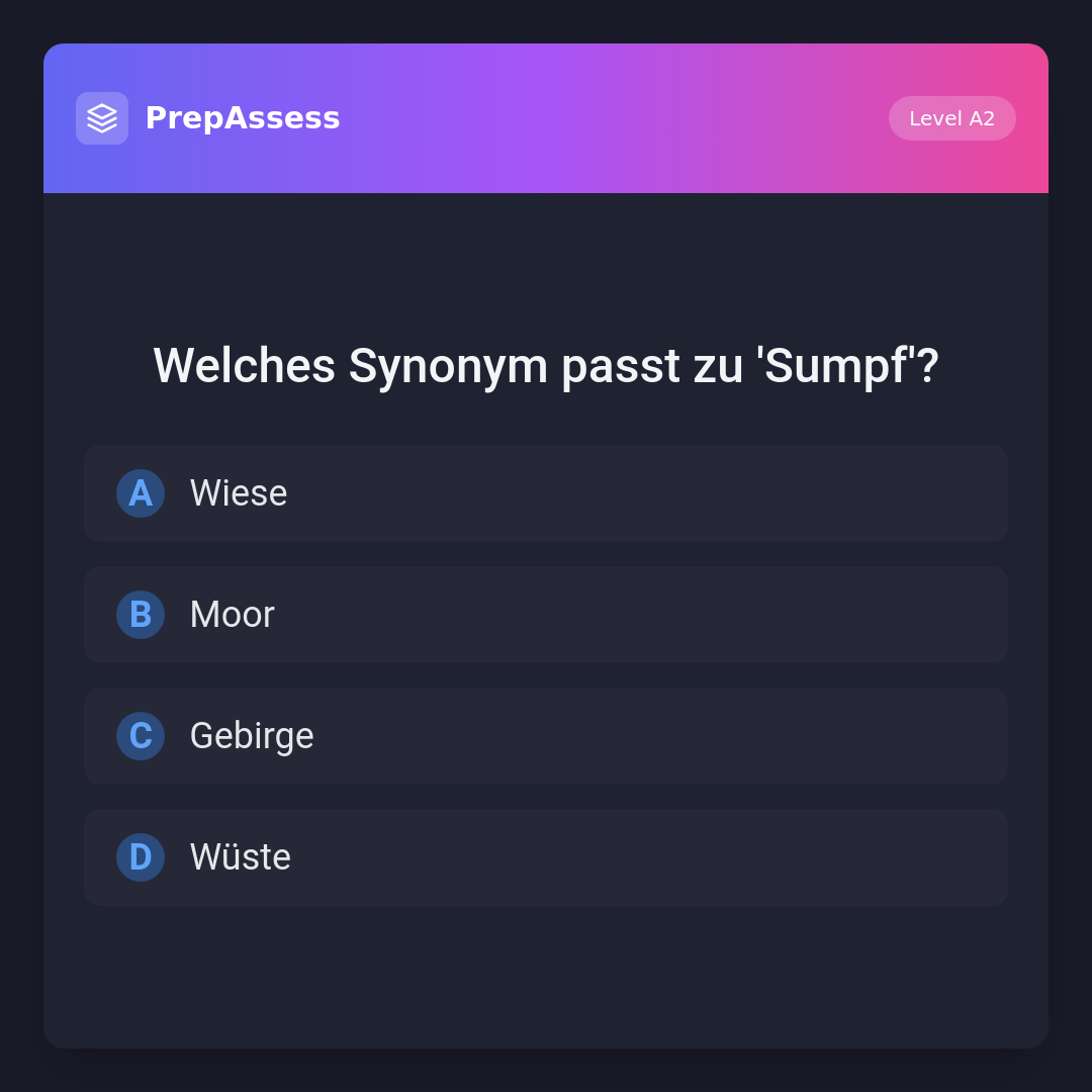 Das Wort 'Moor' ist ein Synonym für 'Sumpf'. Beide beschreiben feuchte, wasserreiche Gebiete. 'Wiese', 'Gebirge' und 'Wüste' sind andere Landschaftsformen und keine Synonyme für 'Sumpf'.