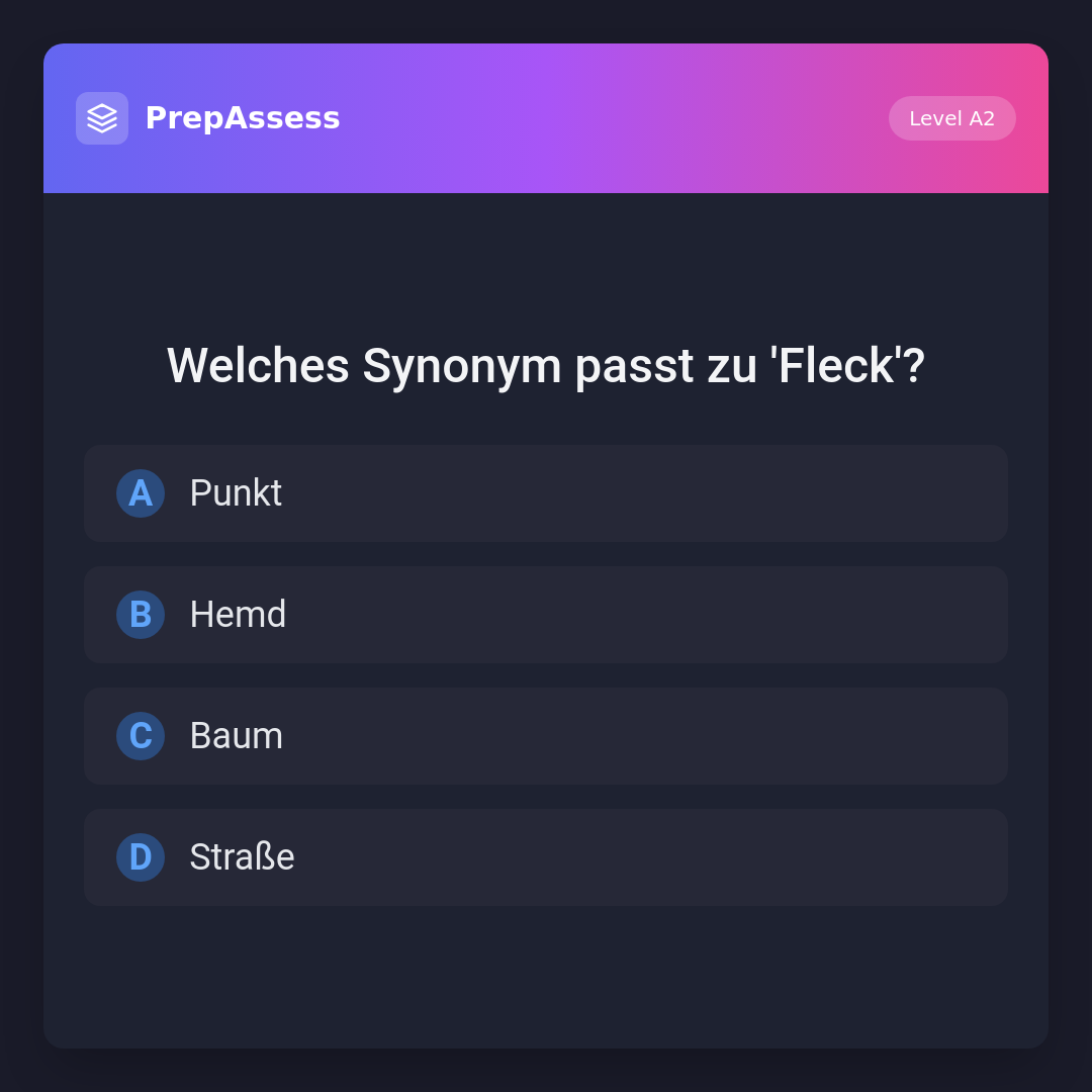 'Punkt' kann in einigen Kontexten ein Synonym für 'Fleck' sein, insbesondere für einen kleinen sichtbaren Bereich oder Markierung. 'Hemd', 'Baum' und 'Straße' sind keine Synonyme für 'Fleck'.