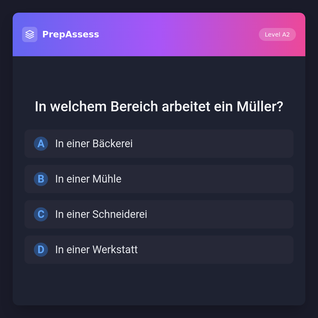 Ein Müller arbeitet in einer Mühle, wo Getreide zu Mehl verarbeitet wird. Eine Bäckerei ist der Arbeitsort eines Bäckers, eine Schneiderei für einen Schneider und eine Werkstatt für einen Handwerker.