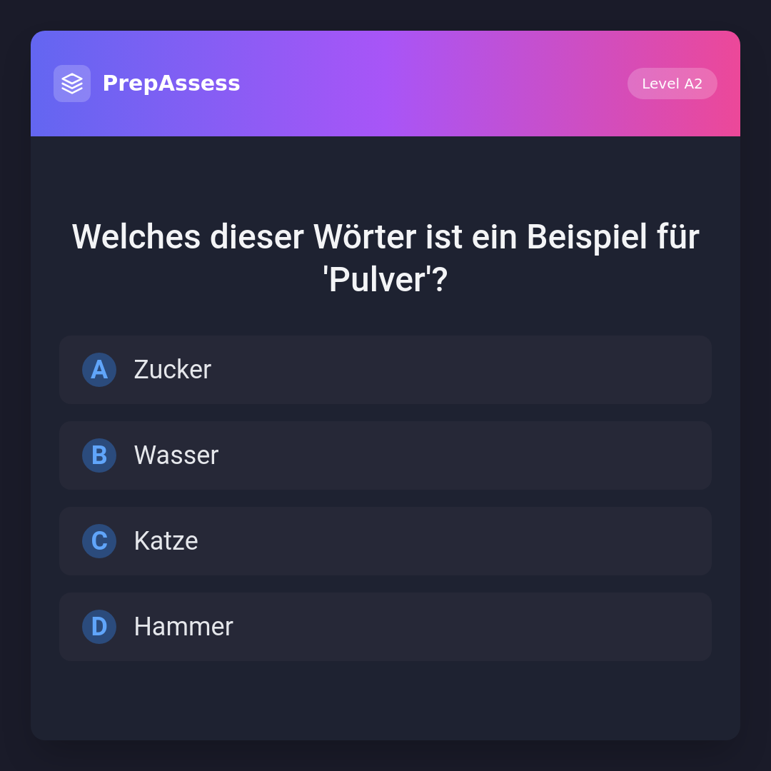 Welches dieser Wörter ist ein Beispiel für 'Pulver'?
