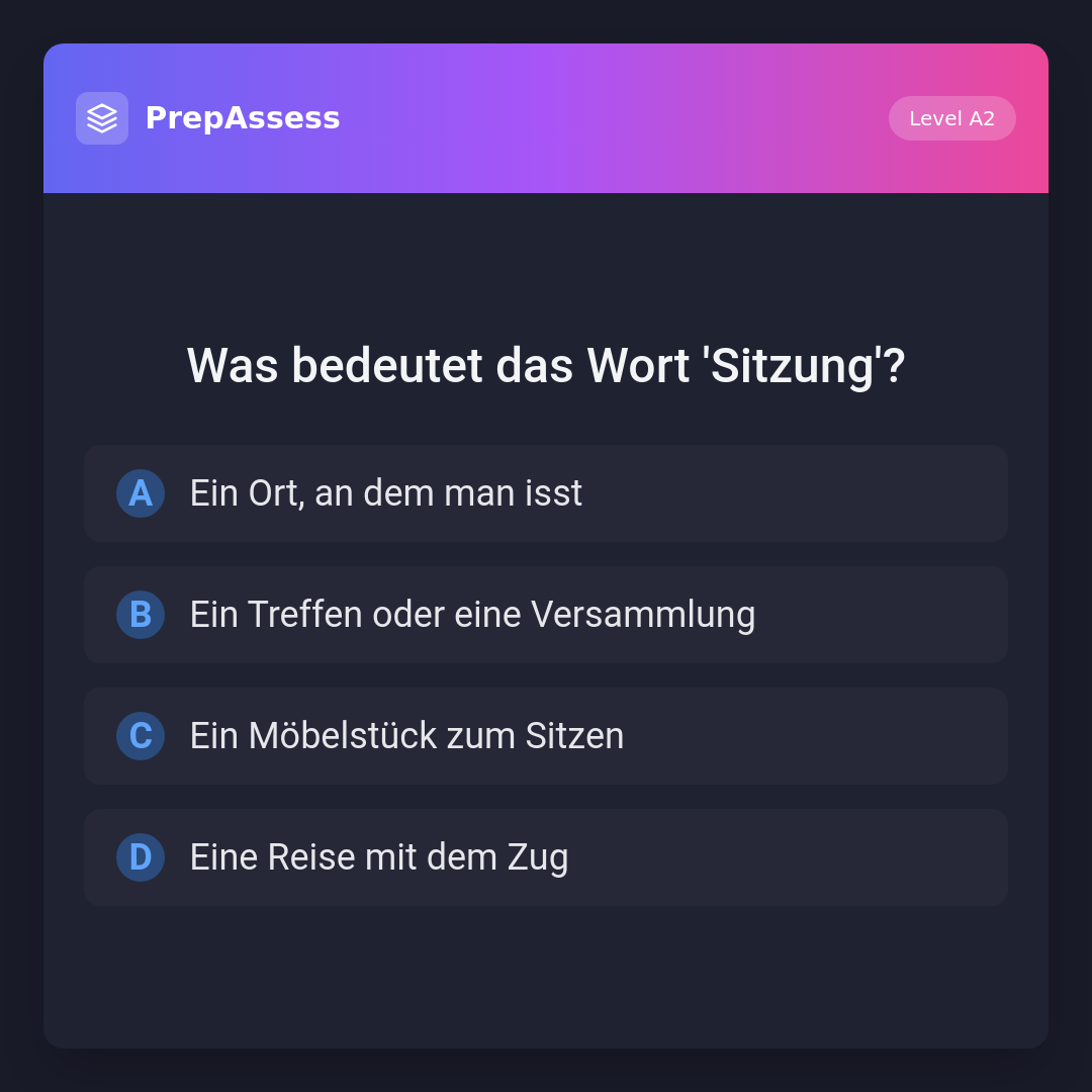 Das Wort 'Sitzung' bedeutet ein Treffen oder eine Versammlung, oft in einem formellen oder geschäftlichen Kontext. Die anderen Optionen beziehen sich auf verschiedene andere Dinge: 'Ein Ort, an dem man isst' wäre ein Restaurant, 'Ein Möbelstück zum Sitzen' wäre ein Stuhl, und 'Eine Reise mit dem Zug' wäre eine Zugfahrt.