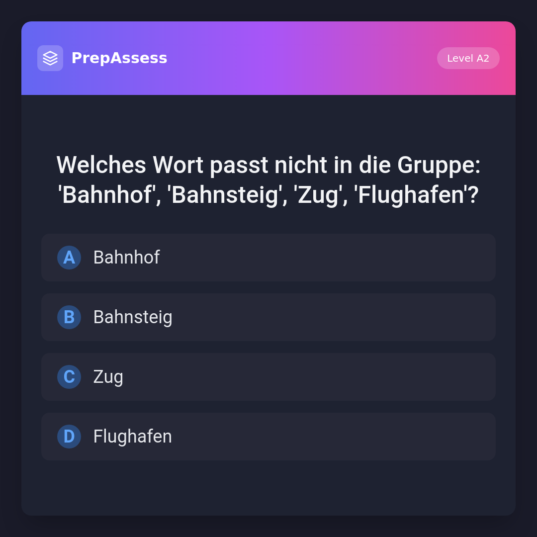 Welches Wort passt nicht in die Gruppe: 'Bahnhof', 'Bahnsteig', 'Zug', 'Flughafen'?