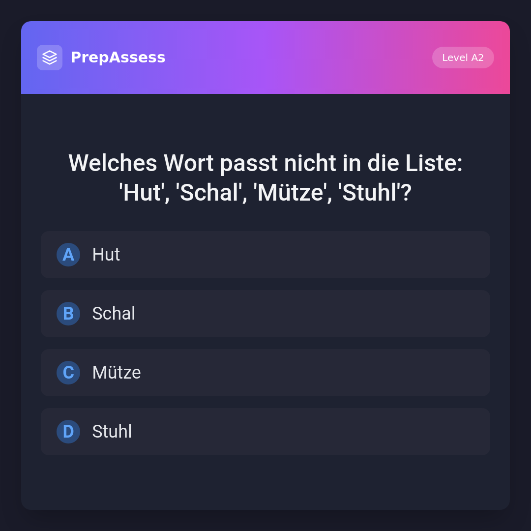 Welches Wort passt nicht in die Liste: 'Hut', 'Schal', 'Mütze', 'Stuhl'?