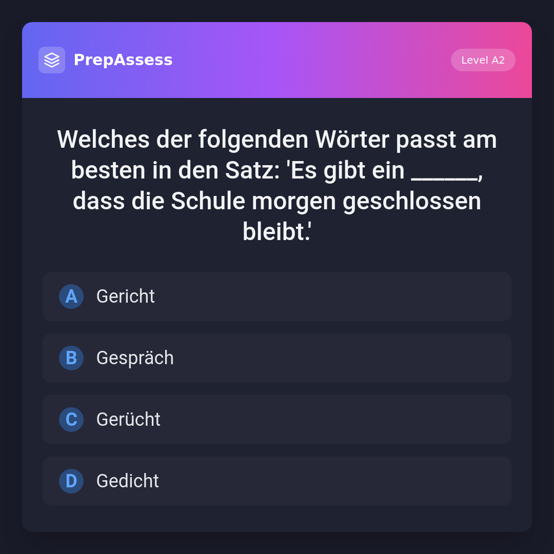 Welches der folgenden Wörter passt am besten in den Satz: 'Es gibt ein ______, dass die Schule morgen geschlossen bleibt.'