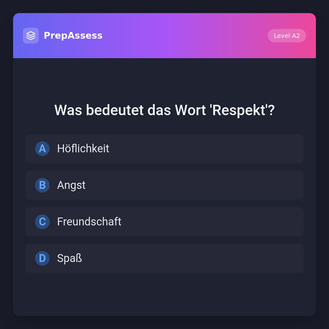 'Respekt' bedeutet Höflichkeit oder Achtung gegenüber jemandem. 'Angst' ist Furcht, 'Freundschaft' ist eine Beziehung zwischen Freunden, und 'Spaß' ist Vergnügen.