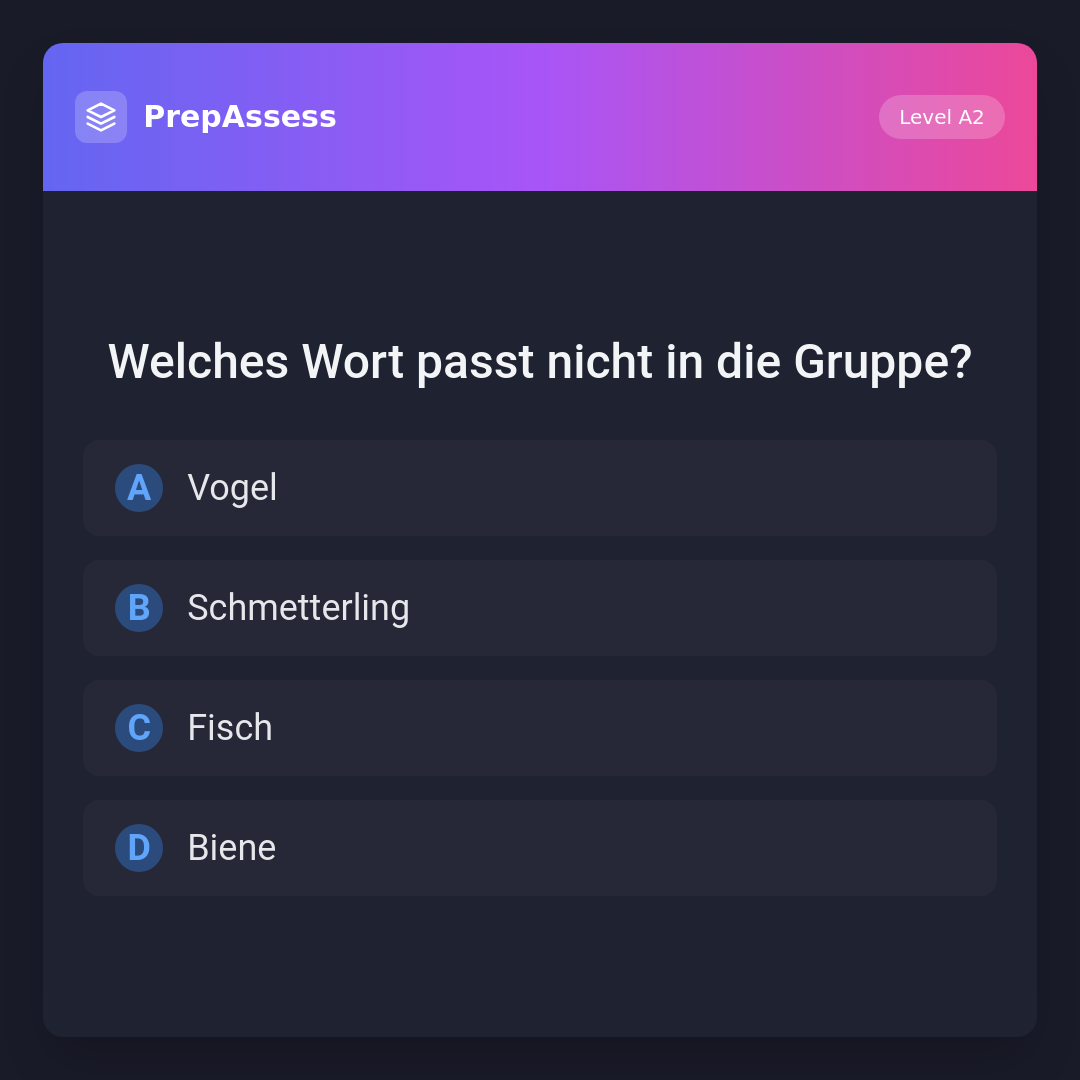 Ein 'Fisch' lebt im Wasser und gehört nicht zu den fliegenden Tieren. 'Vogel', 'Schmetterling' und 'Biene' sind alle fliegende Tiere.